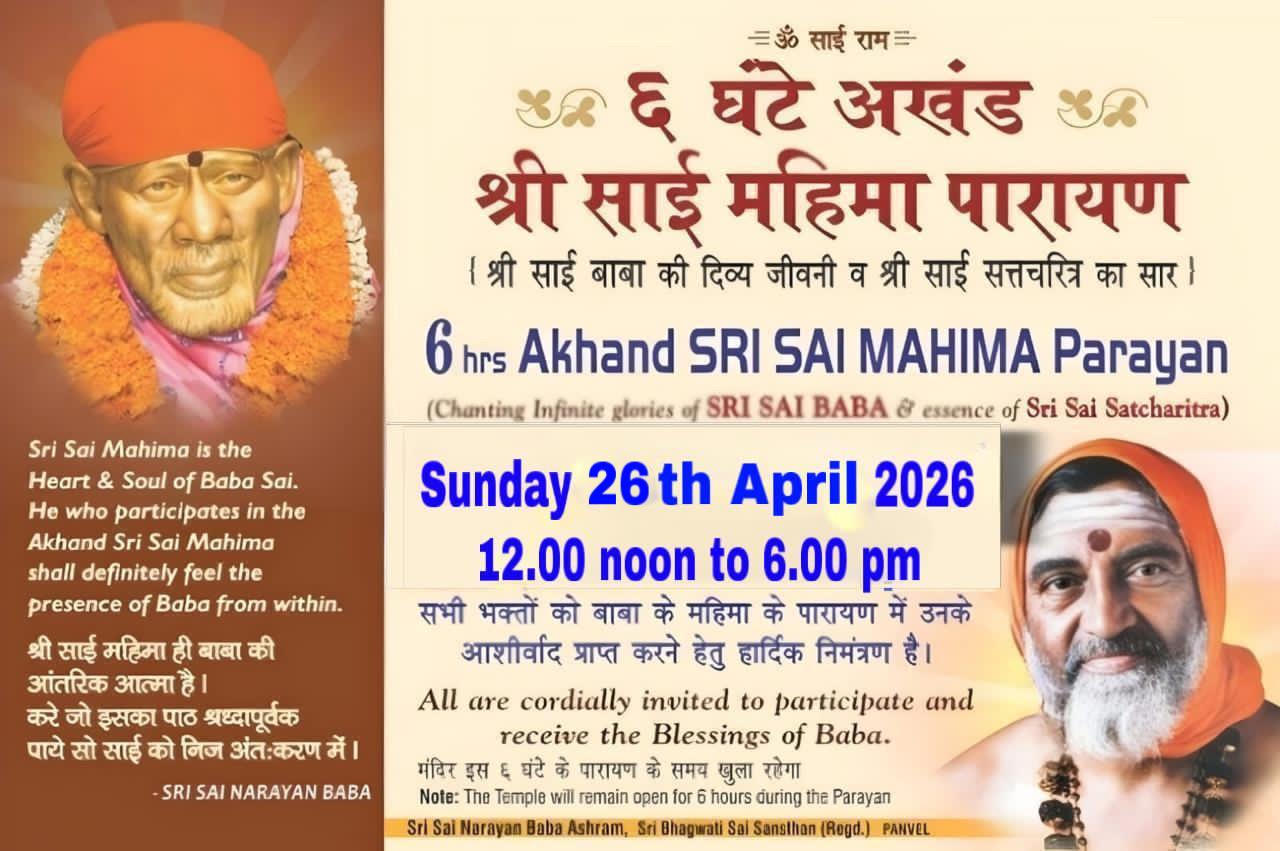 Upcoming Event 6HRS SRI SAI MAHIMA PARAYAN ( 26th Apr, 2026 )